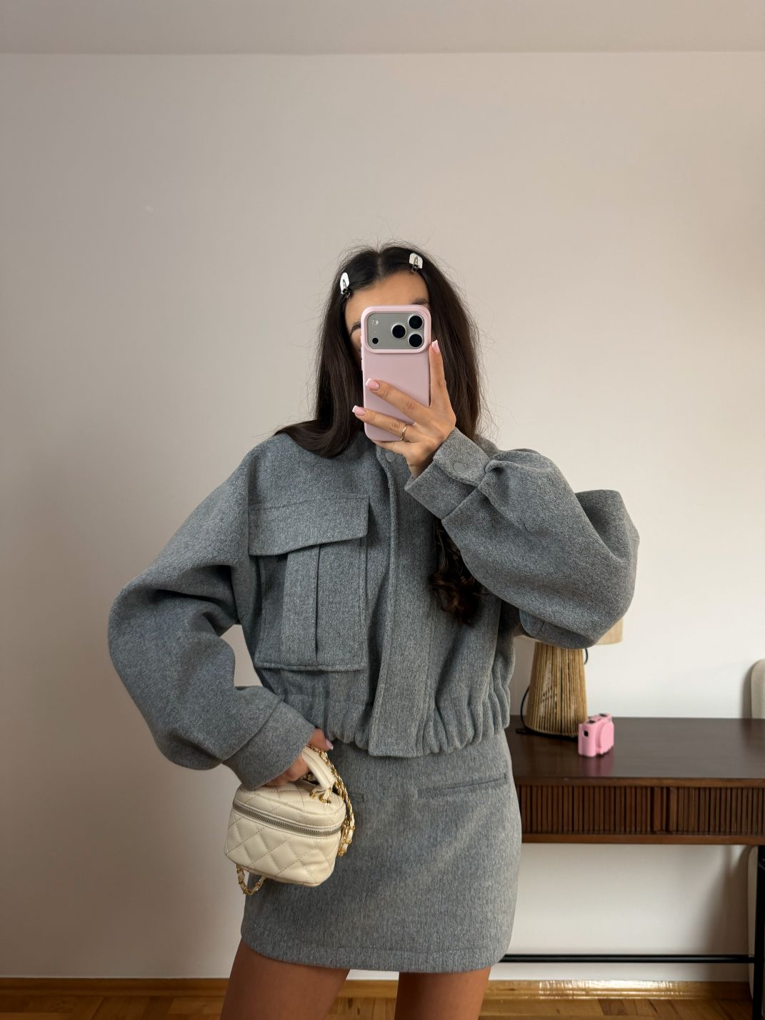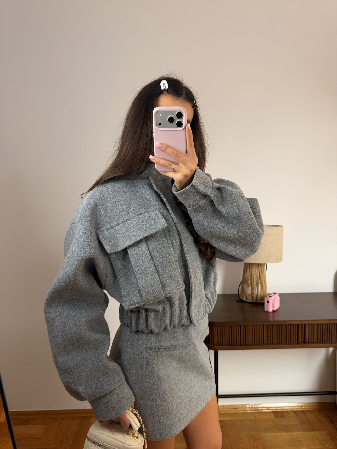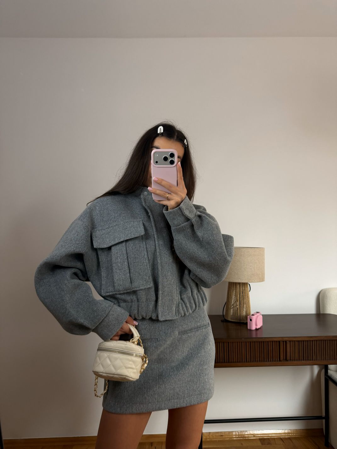Modny komplet spódnica + kurtka wykonany z wygodnego materiału, łączący komfort z elegancją