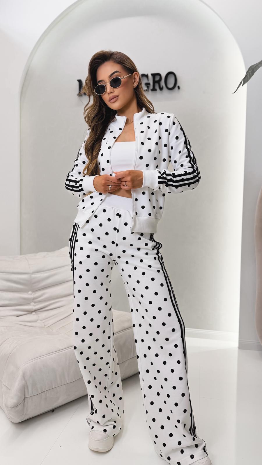 Komplet dresowy w groszki to stylowa i wygodna propozycja na co dzień. Charakterystyczne kropki dodają całości modnego wykończenia i wyróżniają stylizację.