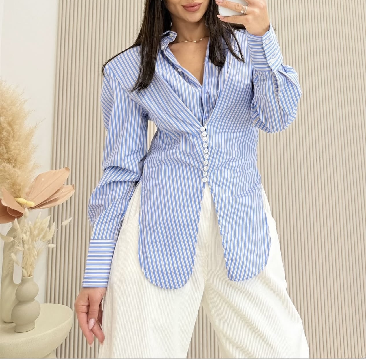 Koszula w paski CLARESA z poduszkami w ramionach, zwężana w talii. Stylowa i kobieca – pięknie podkreśla sylwetkę i dodaje charakteru każdej stylizacji. SKŁAD: 70% bawełna, 27% polimaid, 3% elastan