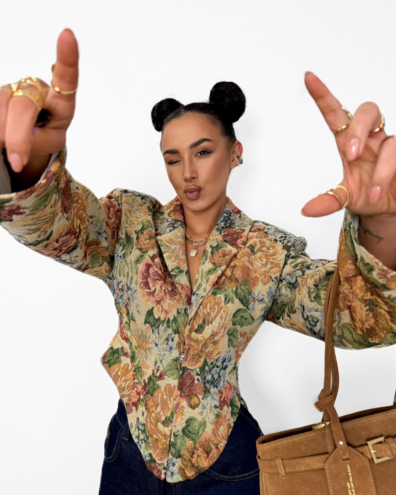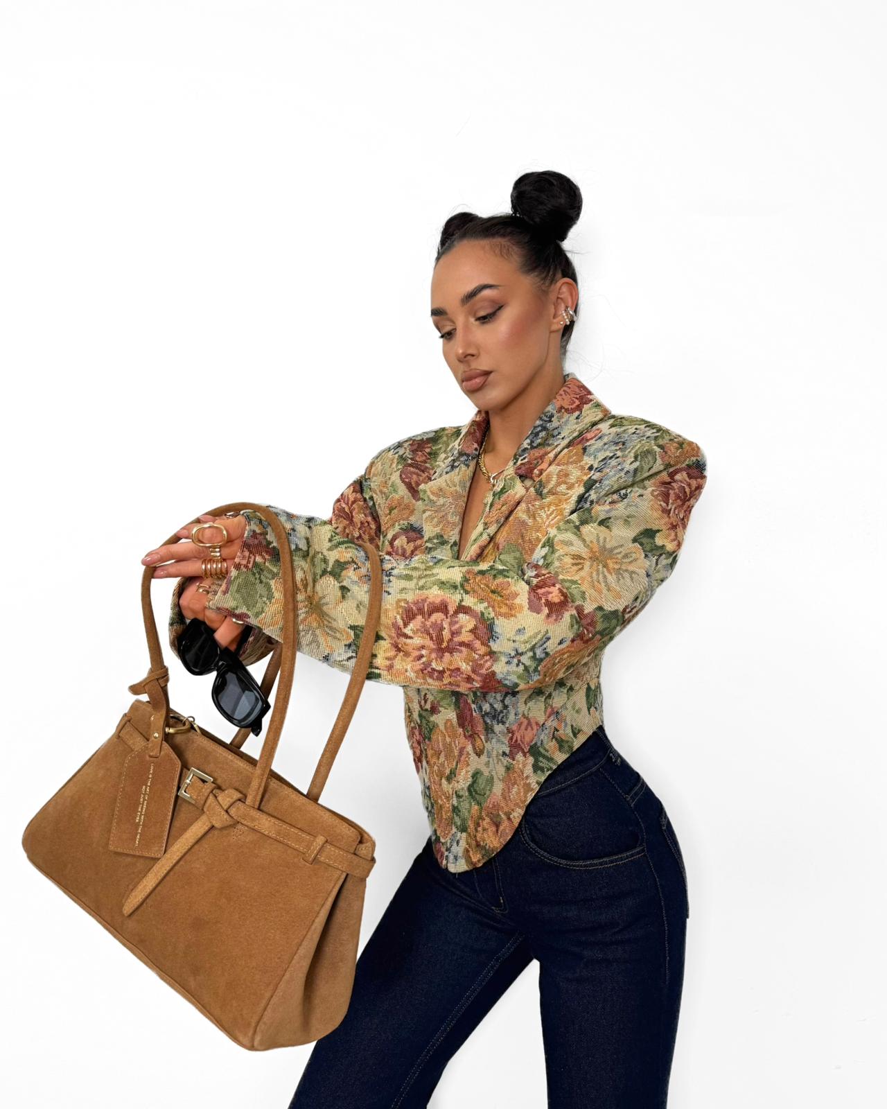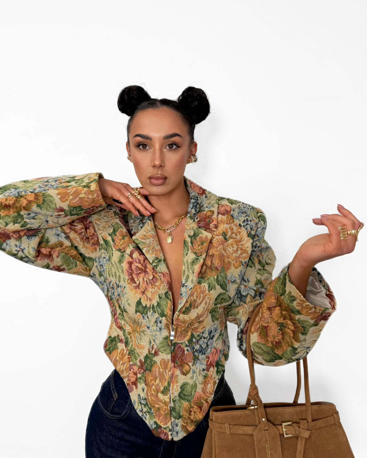 Wyjątkowa marynarka FLORA o kobiecym kroju, która przyciąga uwagę efektownym wzorem w kwiaty. Wcięcie w talii pięknie podkreśla sylwetkę, nadając jej lekkości i harmonijnych proporcji, a zapięcie na zamek dodaje nowoczesnego charakteru.